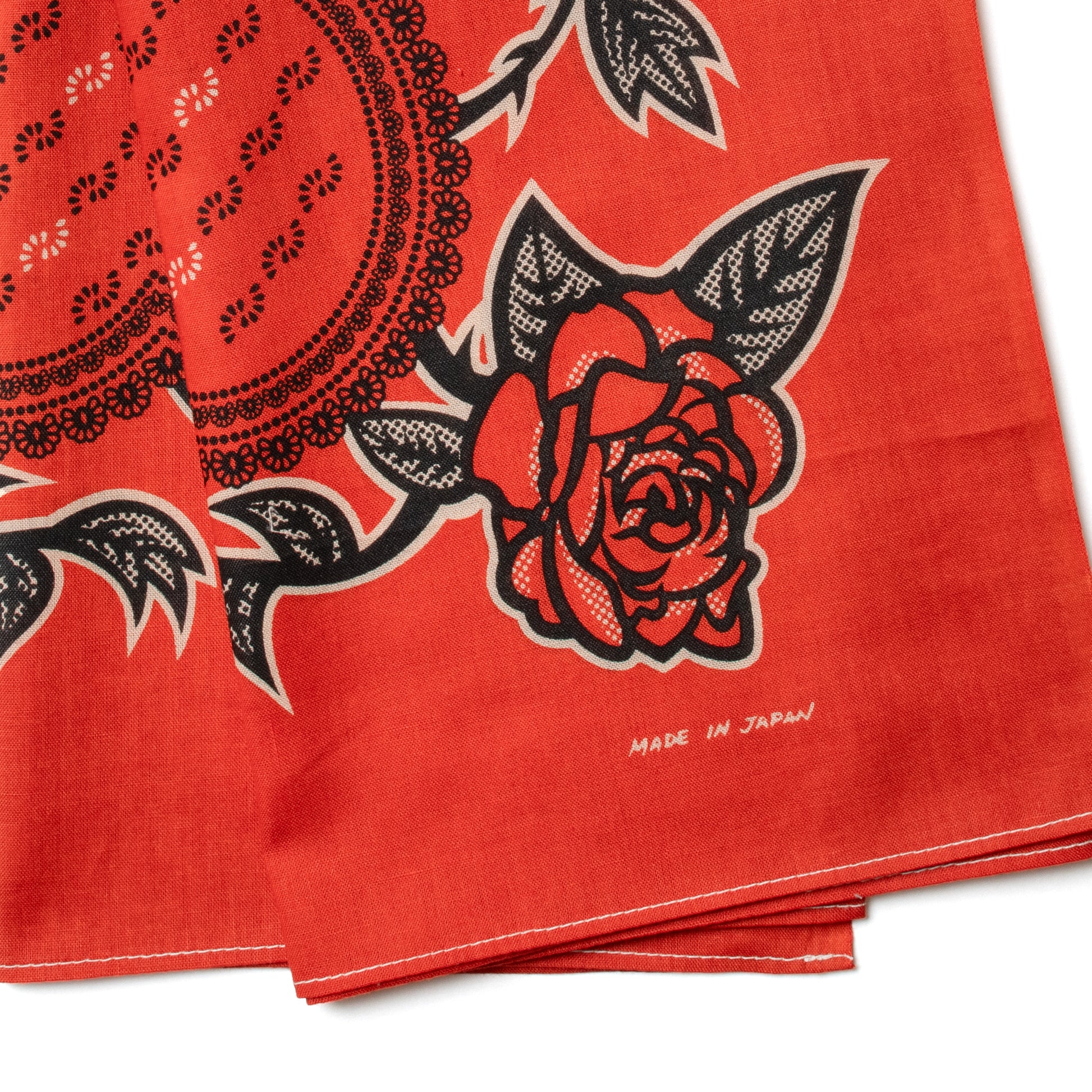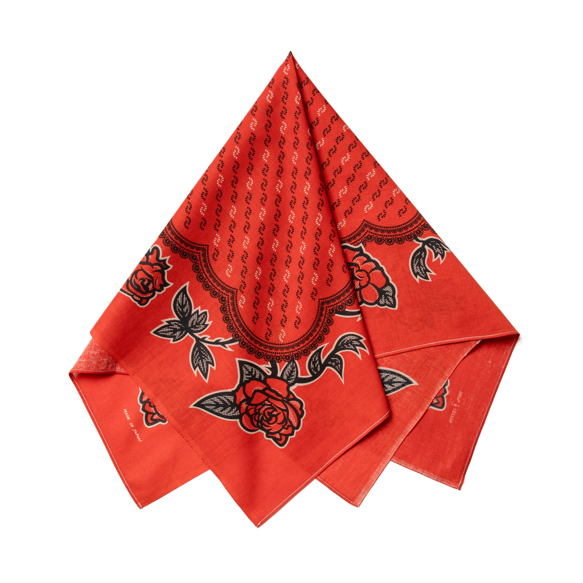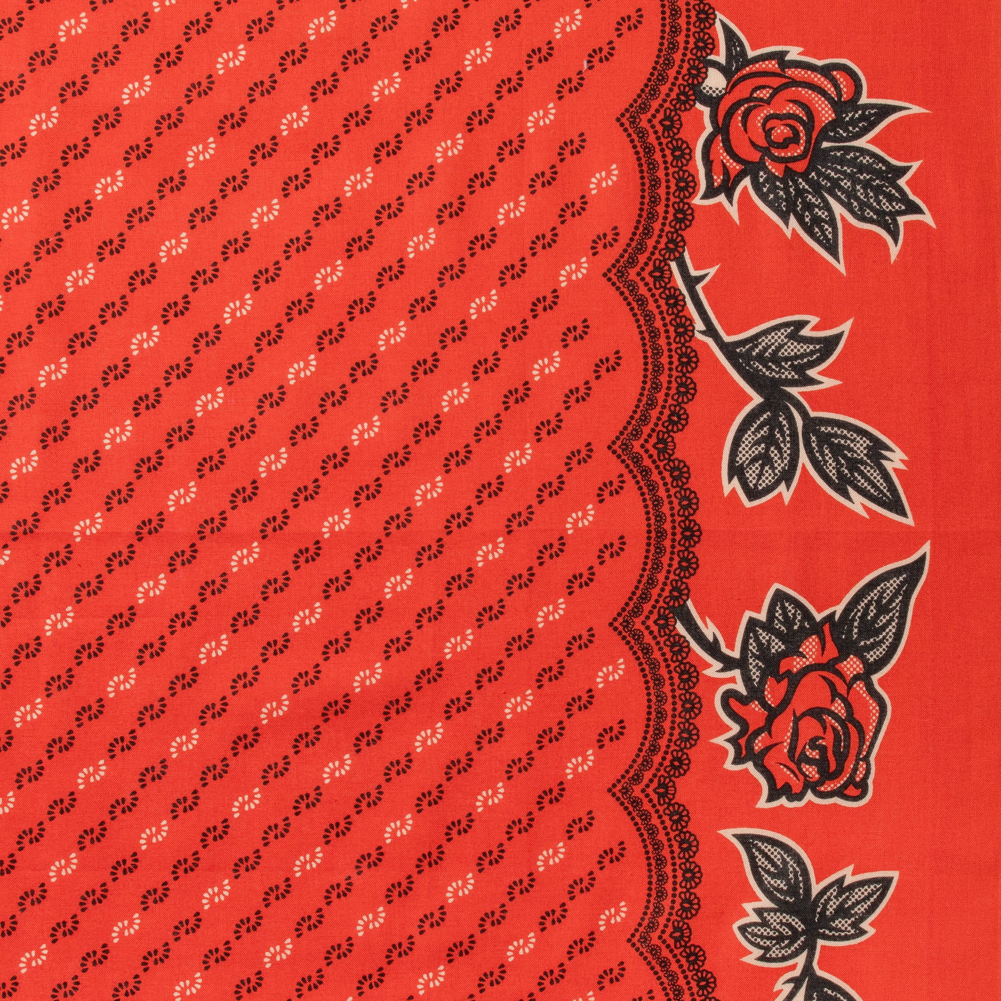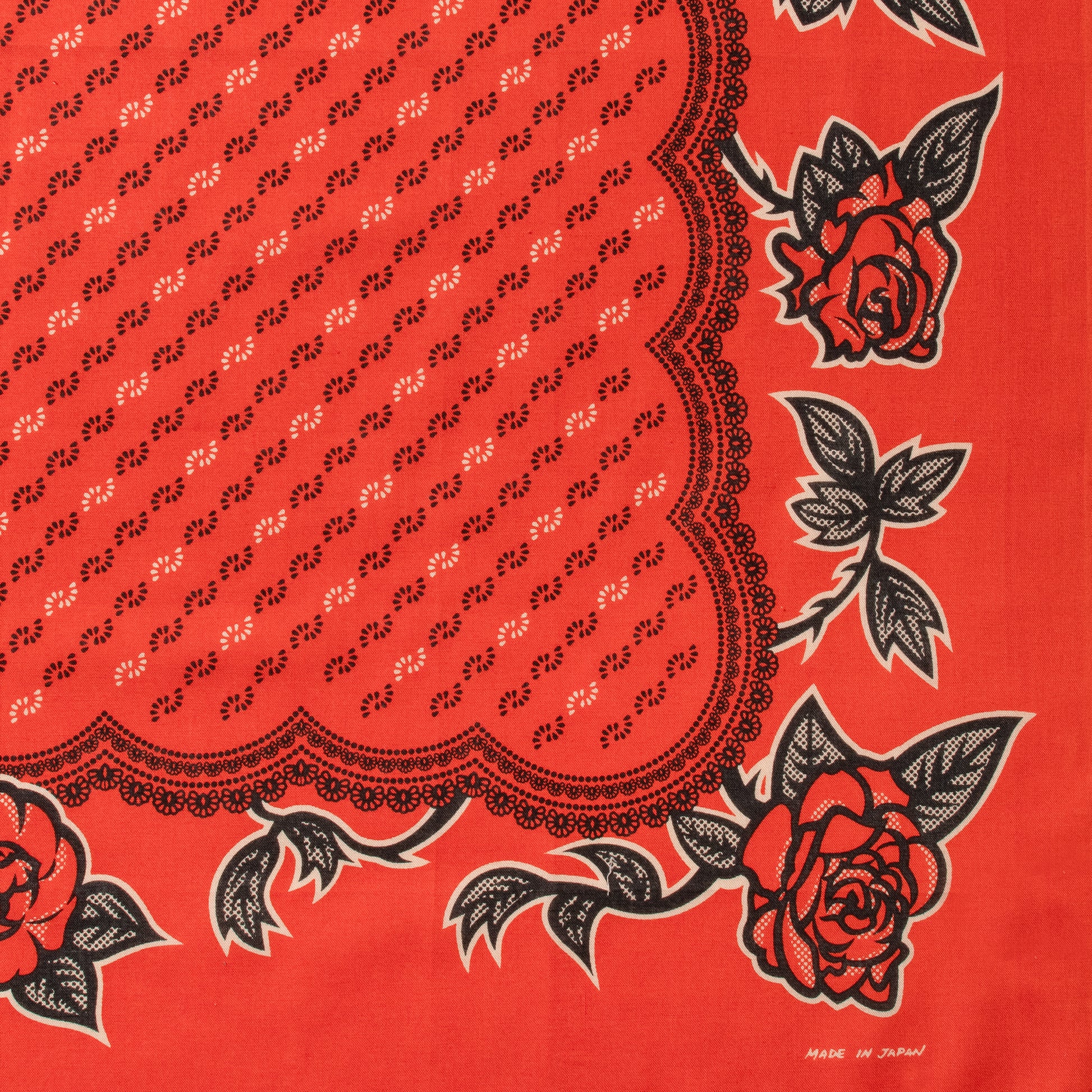 This design was inspired by bandannas from the early 1910s to late 1920s. I call these the urban floral bandannas. Most notably the designs change dramatically from ornate designs of the plains bandannas. The influence of art and taste of pattern gradually shifted from eurocentric to americana in this era. The center motif is simple but the 3 to 1 change in black and white gives it some flair. Instead of using traditional bandanna motifs on the outside of the bandanna we went with tattoo-style roses. The strong lines and dotted gradations add a subtle but playful detail to the design. Its an interesting balance of old and new design ideas and structure.