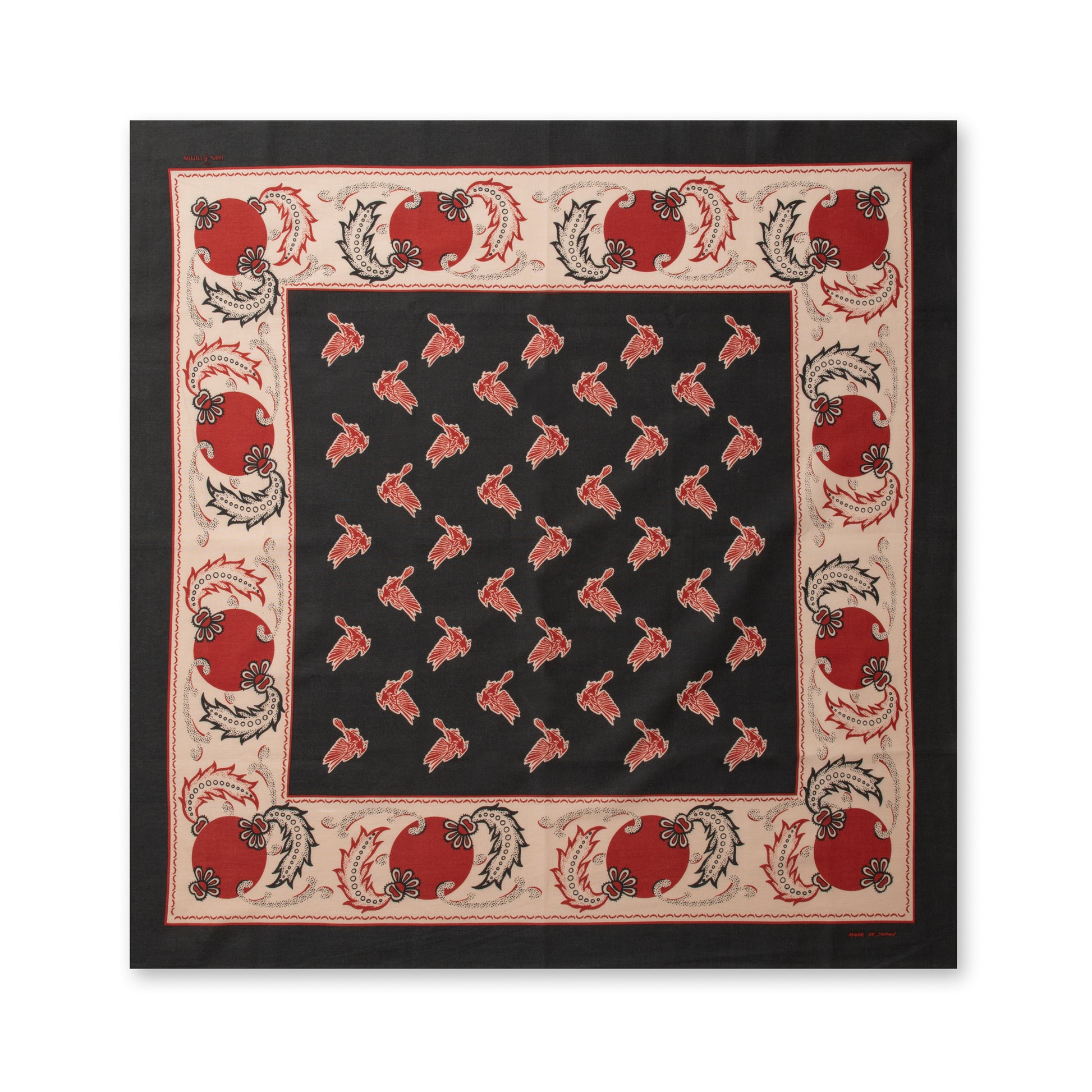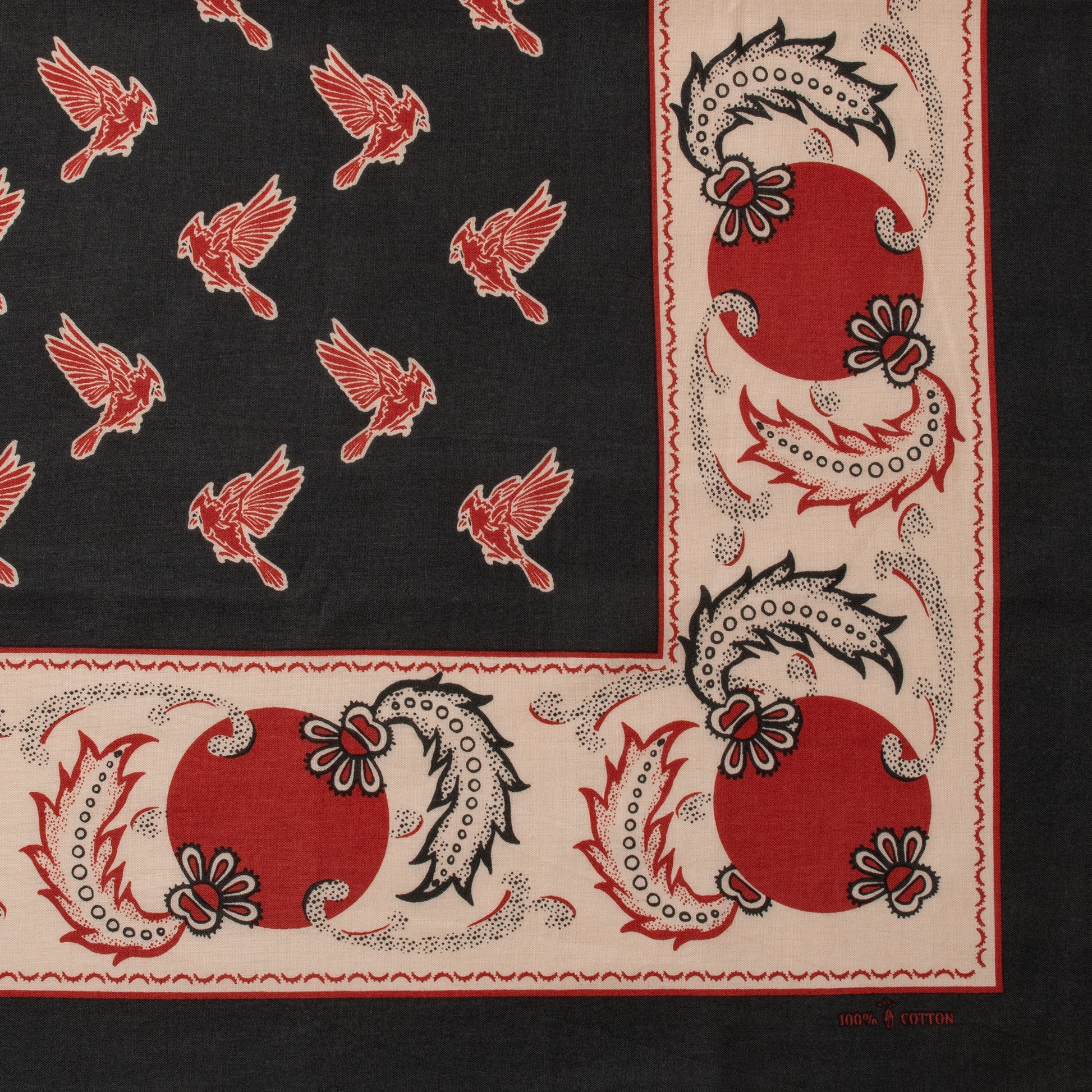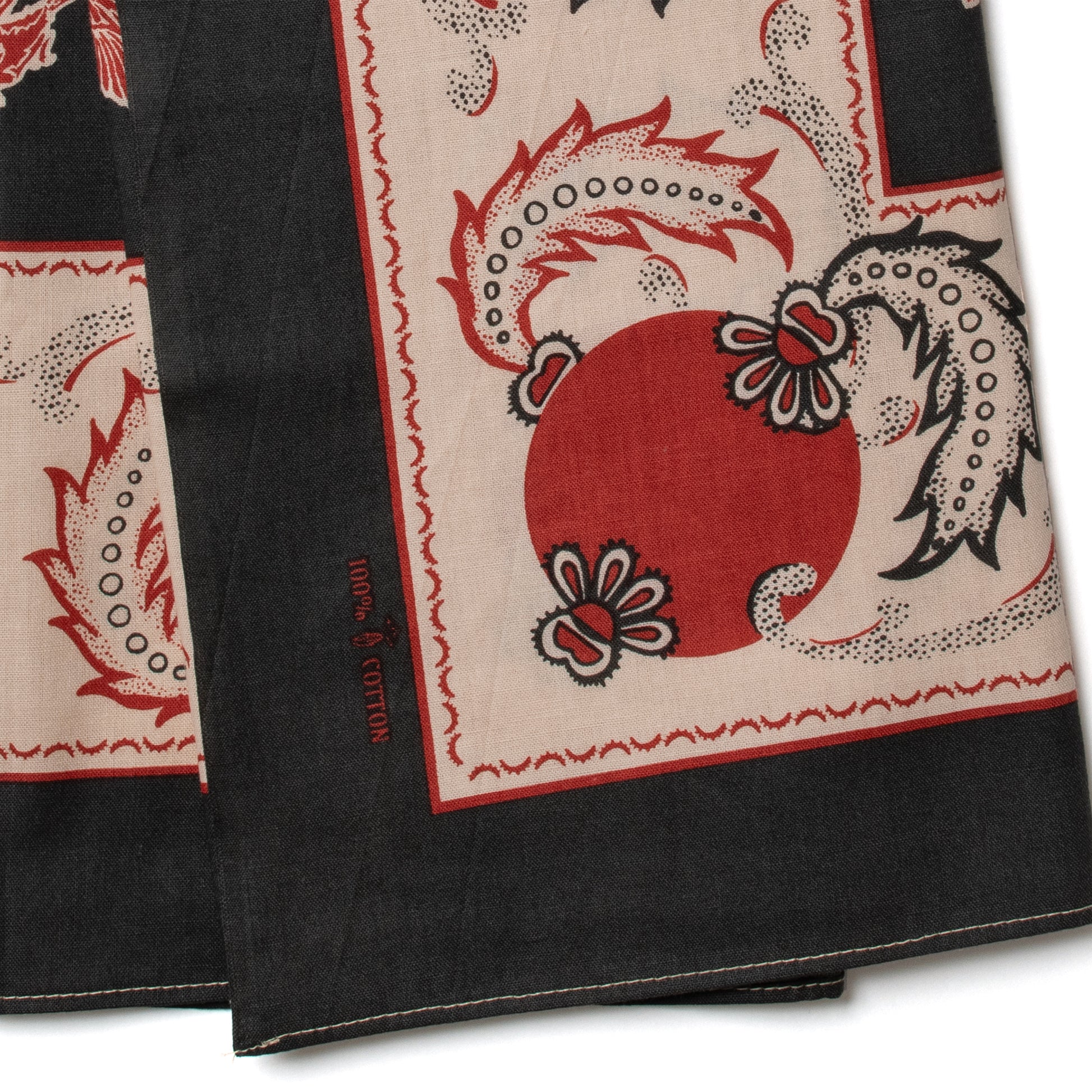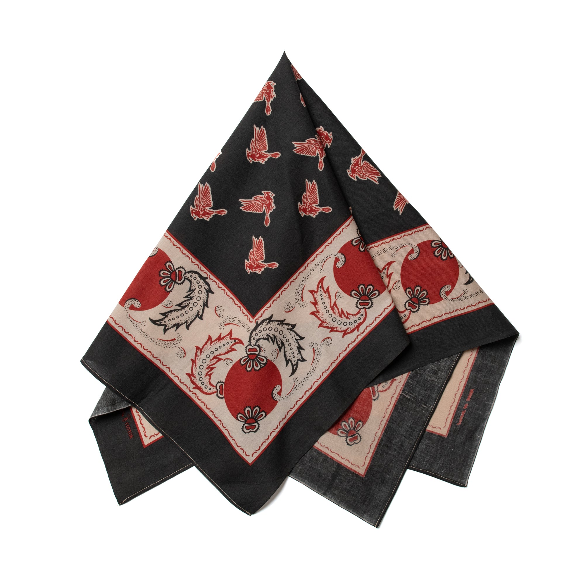This design was inspired by a turkey red bandanna. This era of bandannas is always very interesting detail-wise. The original had a bird motif in the middle and these little feather ornaments on the outside. Yurika and I wanted to change the center motif to something more easily recognizable -cardinals. Entirely redrawn from the original, all the details have been changed and everything is original. I was listening to baroque lute music and this design really meshed well with it. Consider this design a sort of modern antique. We don’t do many black bandannas, but this one is an interesting Japanese hue of black. “Sumi” is a lovely softer black that really looks nice next to deep reds and antique whites.