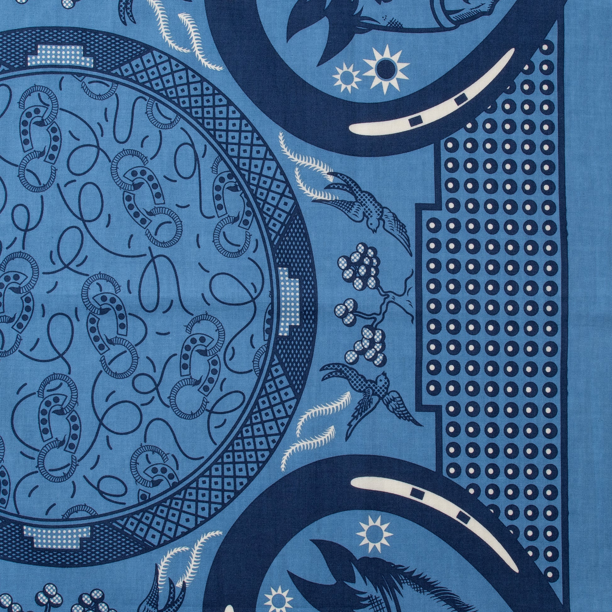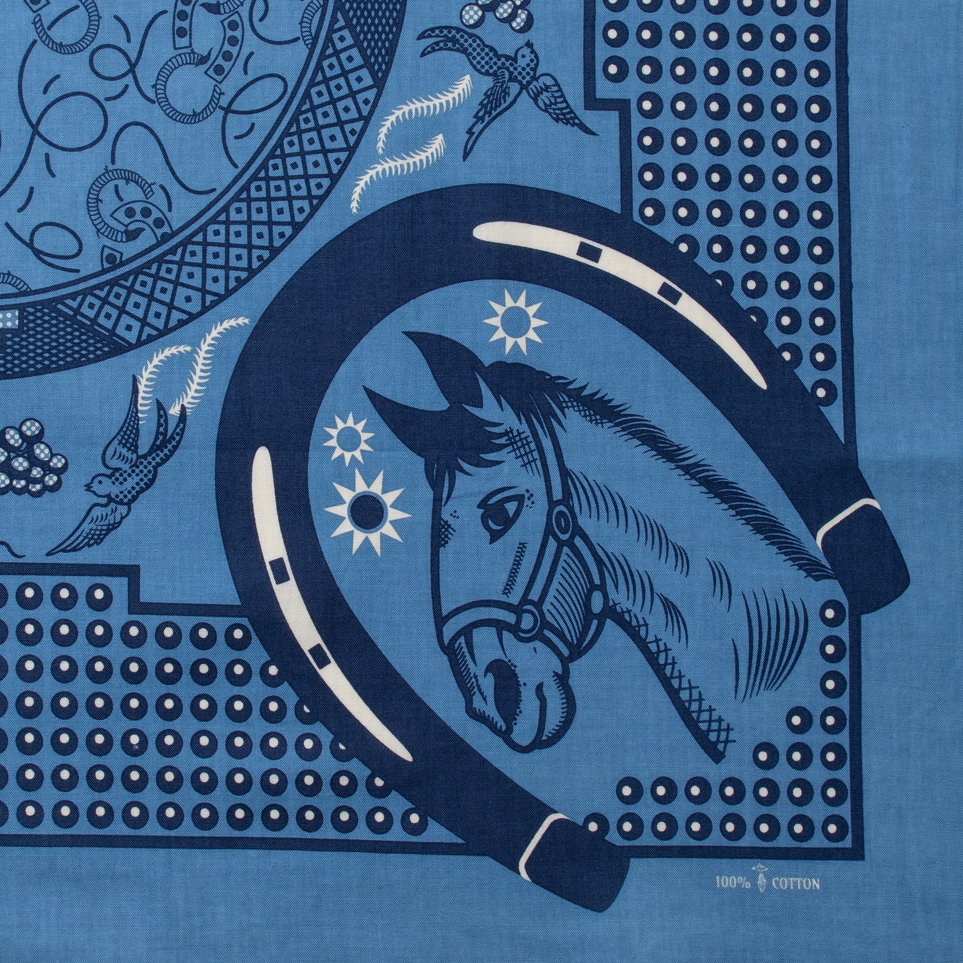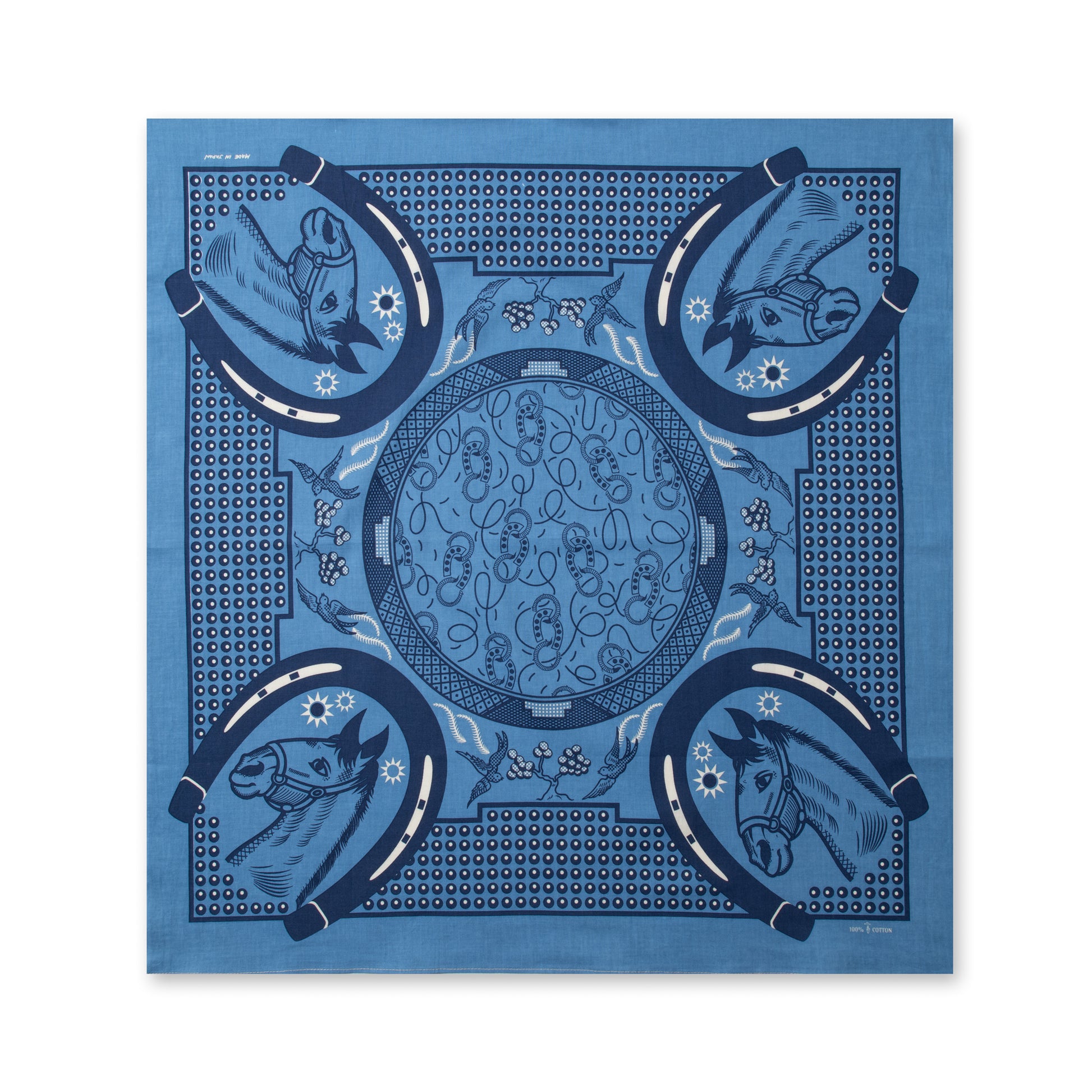 Uma is a design Satoshi Kaga and I have been working on for several months. We were inspired by a friend Stable West to make an equestrian themed bandanna. The main idea was to create a design that was based on blue and white ceramics. Being a fan and collector of these items it was only natural to use similar details and themes. We have included a little bit of East and West here. Notice the Japanese horse shoes mixed with Western horse shoes. The darker shade here will actually be dark indigo and the light a Parisian blue. With little details of ecru to balance it out. This is our first design that we will be offering in 70 x 70 and 90 x 90 cm sizes. This design will also be included in our standard collection so expect to see many color renditions of this design. Releasing summer of 2025.